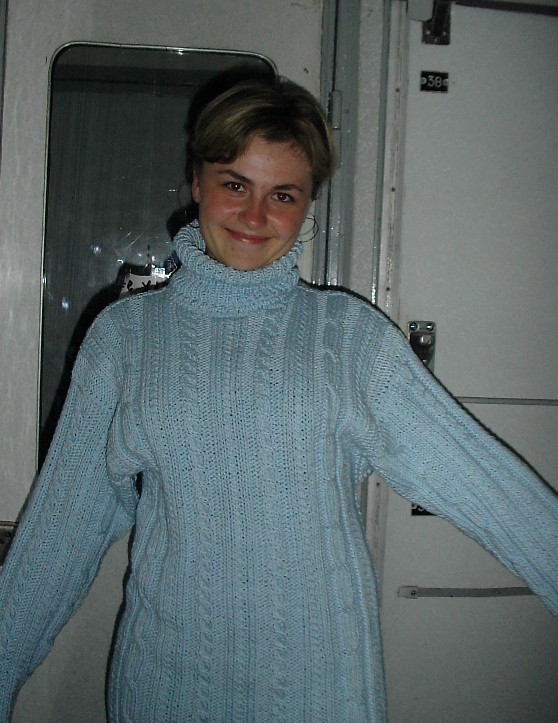 Мы примеряем свитер, связанный нами в подарок Лёше Гоману